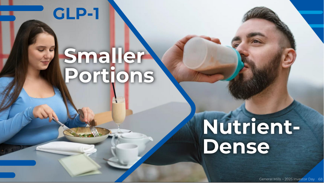 General Mills executive Dana McNabb shared, “The latest research indicates GLP-1 usage among U.S. adults is around 12%, and it’s expected to grow. And our own studies indicate that users are generally split into two groups. One group that largely eats the same foods they always did, just in smaller quantities and portion sizes; and one group that makes more significant changes to their diet. They look for specific product attributes such as protein, for muscle mass and fiber for digestion. In fiscal ‘26, we’re taking action to help address the most critical GLP-1 user needs, leaning into categories that over-index with these consumers like soup, snack bars and cereal. A positive is that many GLP-1 user needs overlap with the needs of our 55-plus consumers. This means the protein innovation and the portion-controlled offerings I just mentioned are going to benefit us with GLP-1 users as well. “