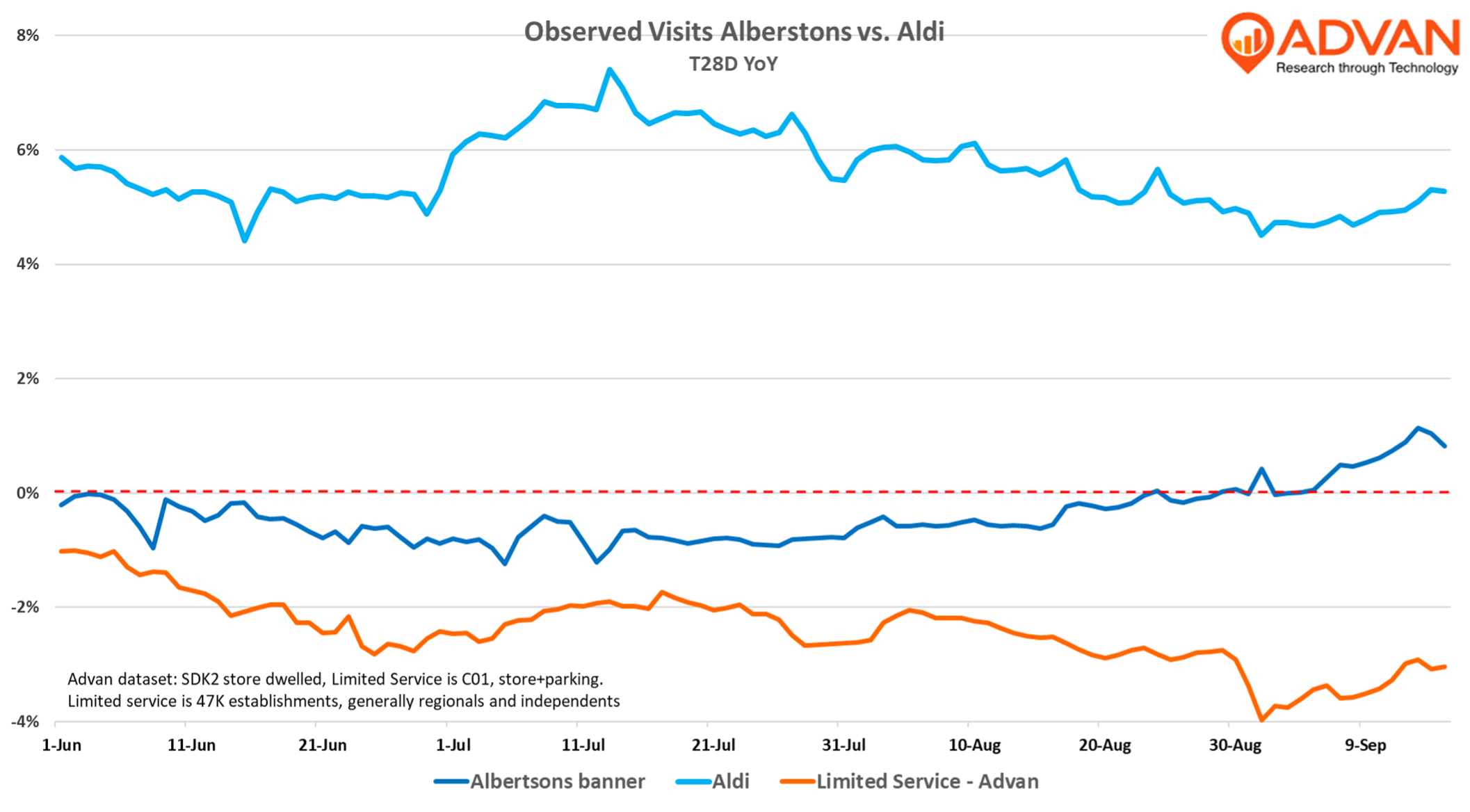 We suspect that the Albertsons’ better traffic trend (shown below), starting in August, is share-of-stomach gains by at-home from away-from-home, particularly limited-service restaurants. We draw that conclusion based upon industry commentary, PCE data, and the traffic data from Advan’s limited-service index, which has deteriorated coincident with Albertsons’ stronger trend. In terms of at-home consumption, the share-of-stomach shift to private brands and the retailers that excel at it (a macro theme of ours) shows no diminution (Aldi > Albertsons). Additionally, the T12W trend for center-store categories (i.e. packaged food) volume per NielsonIQ scanner declined -1.9% overall. Within that decline, private label is up +0.5, whereas national brands are down -3.5%.