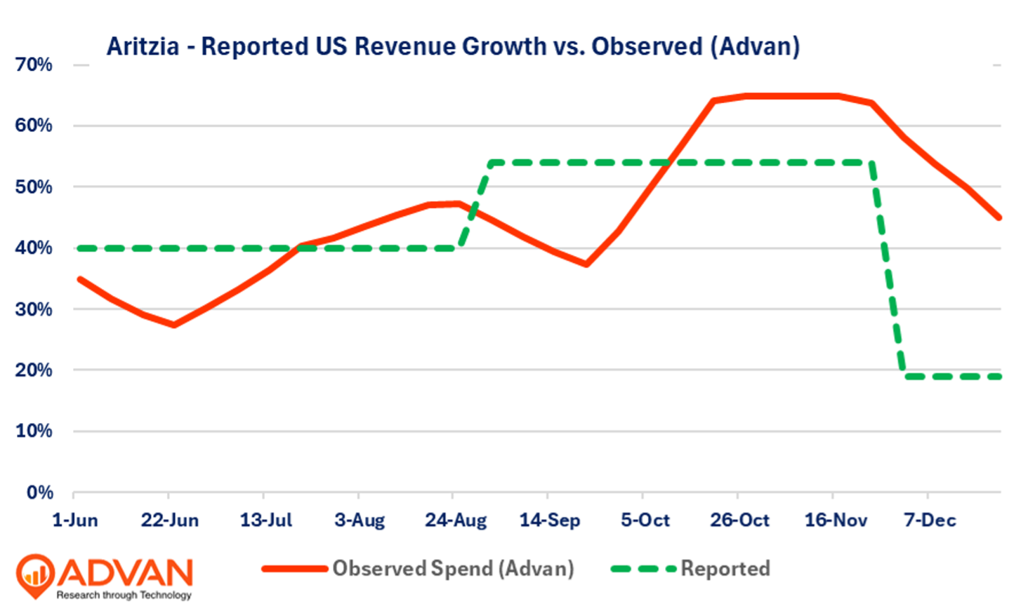 - Aritzia reported very strong sales growth for its fiscal Q3, +54% for the US region, and while management guided for a slower rate for FQ4, Advan’s transaction data points to ongoing strength (+50%) suggested a lot of conservatism in that guide.