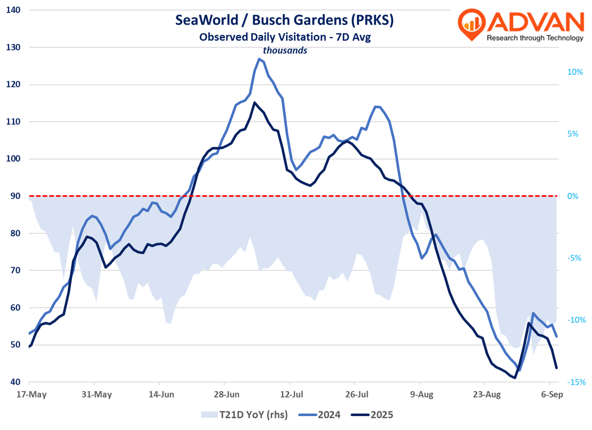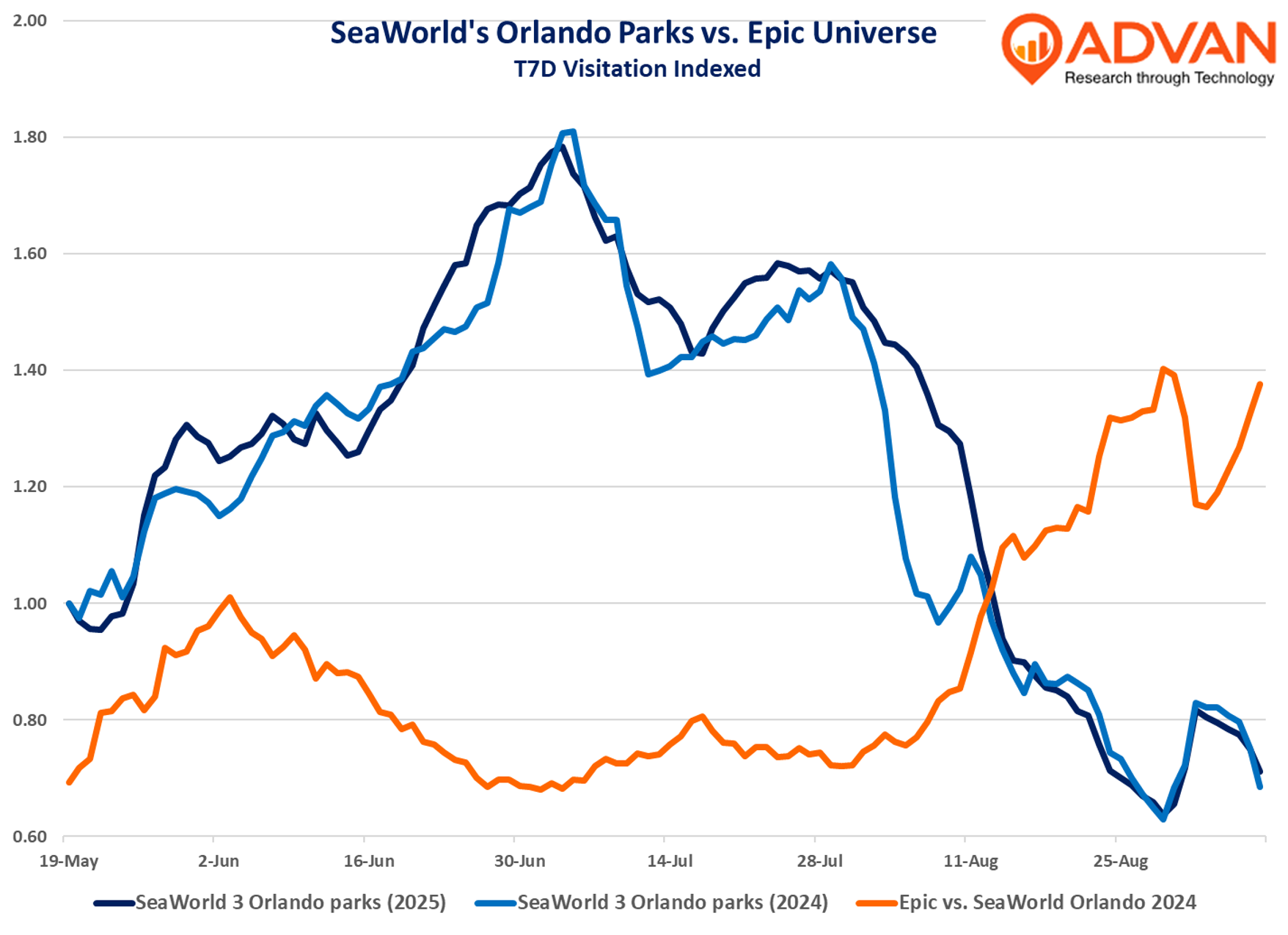 On its Q2 earnings call, United Parks & Resorts (PRKS) CEO Marc Swanson said, “We saw an increase in attendance at all of our Orlando parks, including SeaWorld Orlando, Aquatica Orlando and Discovery Cove… our SeaWorld Orlando Park has been up in attendance since Epic opened on May 22. It was up for the full second quarter, and it was up if you measure from the date Epic opened through the end of the second quarter. It continues to be up quarter-to-date in the third quarter through August 6 on a day-to-day basis, and we expect attendance for the remainder of the year at this park to be up as well.” The following chart confirms that statement, especially early August. (The number of observed visits between May 22nd and August 7th was flattish YoY, but International visitors will have added 100 to 150bps to the growth rate.) Interestingly, Epic’s strong spurt of growth in August and early September coincides with a give in the SeaWorld trio’s outperformance to 2024. We suspect that Epic’s spurt is due to Universal making more tickets available.