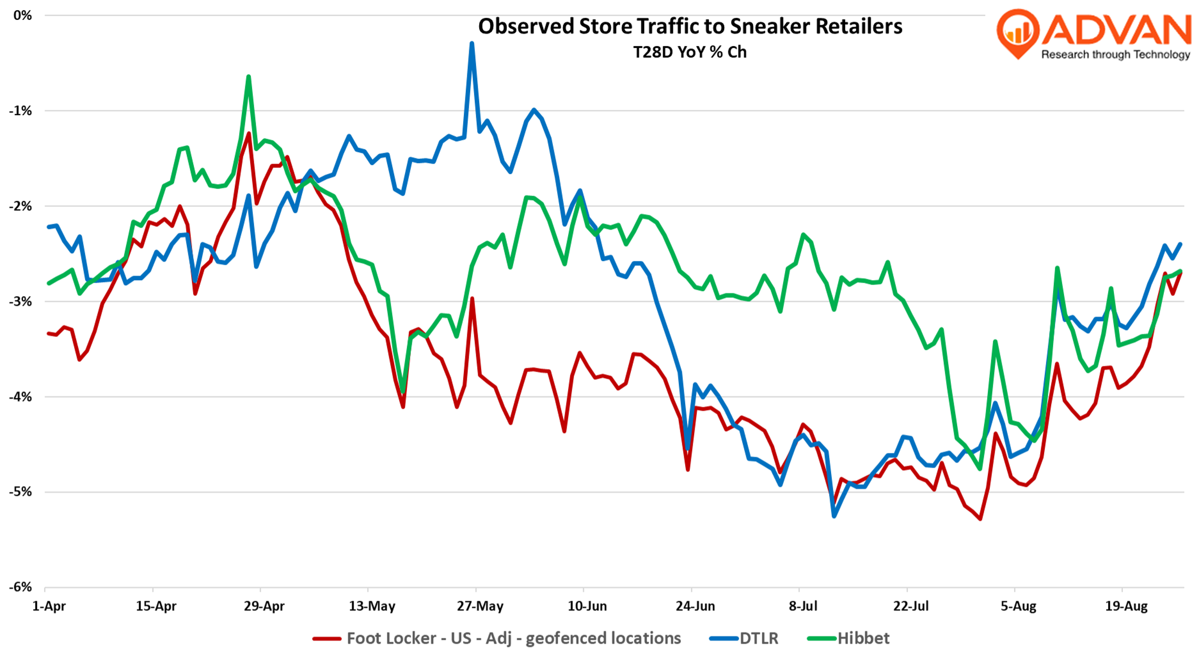 Lots going on in the sneaker space with Dick’s Sporting Goods set to close on Foot Locker on September 8th and fiscal quarter results showing sequential improvement for the major retailers (save WSS which is weighted to the low- to moderate-Hispanic consumer). Part of the better sales is lift was due to the broadly strong back-to-school season that we’ve been reporting on, the other part of it is tariff cost pass-through are driving comp-ticket; average transaction increased +4.8% for Foot Lockers’ Q2 (Advan). As it relates to retailer results, Foot Locker reported a +1.4% increase in North America comp-sales. If one were to strip away WSS, the region’s comp would be +2.6%. JD Group reported a comp-sales decline of -2.3% for North America, was better than last quarter’s -5.5% decline; the earnings release cited stronger performance by the DLTR and JD banners. The release did not comment on Hibbett, which our data suggests did better than the industry. As to the footwear brands themselves, the Adidas brand reported +15% growth for North America in calendar Q2, On Running +24%, HOKA grew modestly, and **Nike **is expected to post a high-single-digit decline in sneakers for the June – August period.
