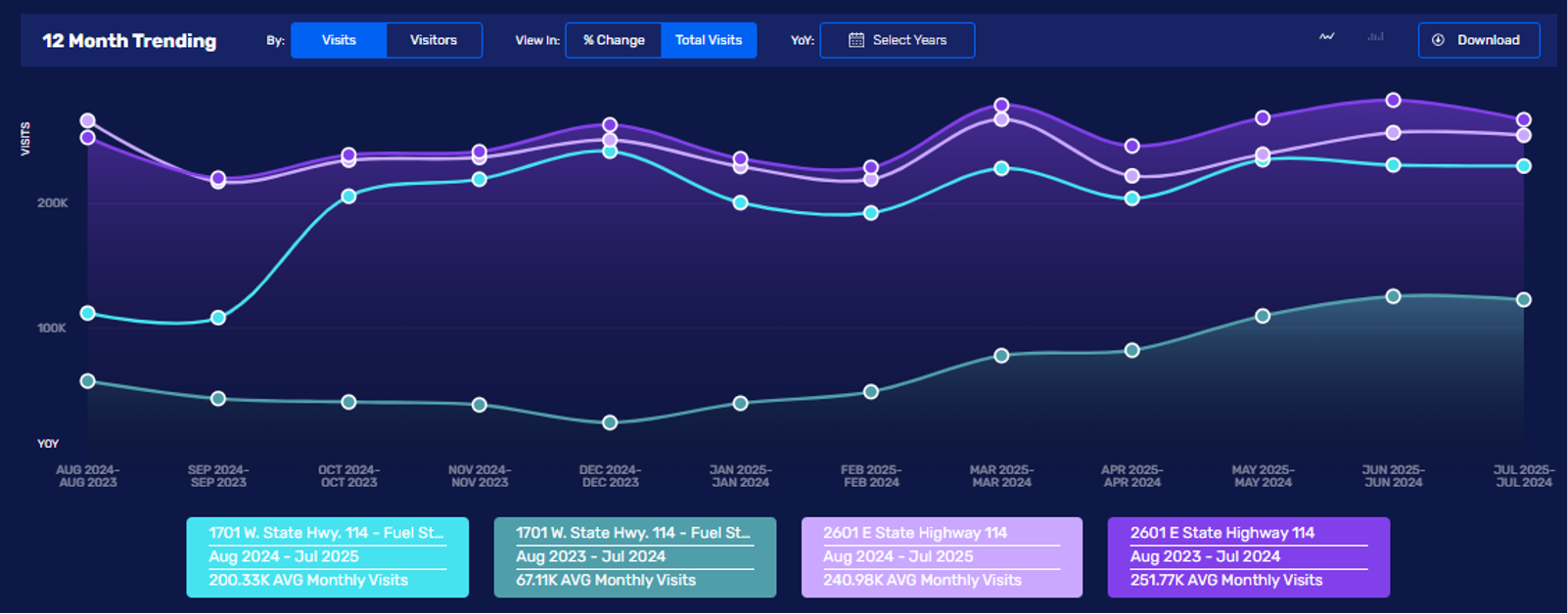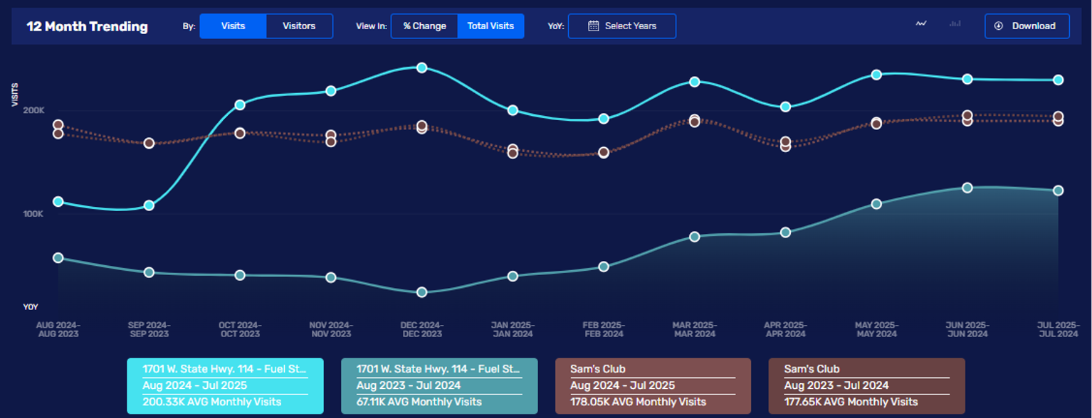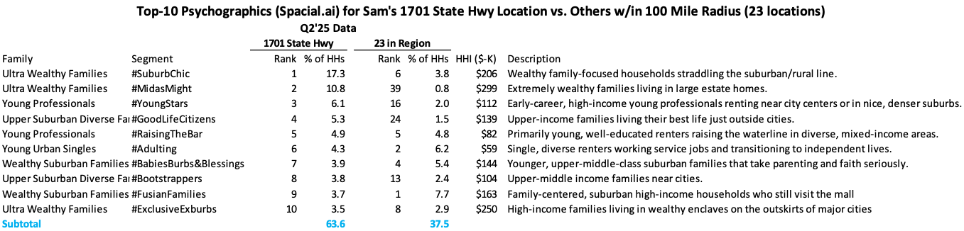 Like Walmart, Sam’s is benefitting from its “contemporized” sales mix and convenience; store-delivery increased 50% YoY and it now makes up 5% revenue (per our estimate). Curbside increased double-digits. As a contributor to Sam’s total business, e-commerce, which includes store-delivery, curbside, Sam’s.com , and adverting, is a surprisingly large 18% of revenue (ex-fuel). That’s a lot of contemporization! By contrast, store-delivery and curbside are relatively small businesses for Costco. If we add those contributions to Sam’s comp-transactions, the figure increases to +3.9% and similar to Costco’s performance. BJ’s is similar to Sam’s with rapid growth in digital, including the impact on observed visits. Advan estimates that it has reached 15% of non-fuel revenue for BJs, and over 90% of the digital sales are fulfilled by the clubs with services like BOPIC, ExpressPay or same-day delivery. CEO Eddy said, “Our focus on convenience is shown in our digital results with growth of 34% this quarter and 56% on a 2-year stack basis, driven by consistently robust BOPIC and same-day delivery expansion and rapidly increasing penetration of ExpressPay. Our digital adoption sets new records every quarter and our app usage continues to grow with more than half of our active members now regularly using the app.” Readers will remember that we’ve been highlighting units per transaction (UPT) as a critical metric to monitor as it typically precedes directional changes in comp-traffic, Sprouts / Grocery Outlet were ’23 / ‘24 examples of this to the + / -. The table’s across the board increase in dwell time implies higher units-per-transaction (UPTs) and successful merchant execution for all four brands. For Sam’s, Scan-&-Go penetration increased 600bps YoY, which ceteris paribus, is a dwell time moderator. Thus, Sam’s +200bps improvement in UPTs is better than what the increase in dwell time implied. Sam’s CEO Chris Nicholas said, “And that’s one of the big reasons we’re trending so much younger with our new members that we’re acquiring. So I think it’s online, and I think it’s physical too, and I’m excited about what the future looks like for Sam’s Club.” Target’s comp underperformance stemmed from weak traffic and increased markdowns, not UPTs, which improved QoQ. Last fall, Sam’s opened its new club format in Grapevine (1701 W State Hwy 114), which doesn’t have traditional checkout POS; it’s solely Scan-&-Go (vs. approx. 40% of transactions chainwide). The location also has twice the number of curbside spots (32) of a typical club location. As shown in the chart below, Grapevine does 12% more traffic than the average of the 23 Sam’s in the region (100 mile radius). Due to the Scan-&-Go, its dwell time is 4% less than the region’s average. The Grapevine location has a more-affluent customer than the average; it’s median HHI / percent-of-households with >$125K in HHI is $142K / 46% vs. $102K / 28% regional average. (Remember that as the affluent out-spend the average, their contribution to the location’s sales will be far larger than these %-figures.) Looking at the differences one layer deeper is shown in the following table of top-10 clusters out of Spacial.ai’s 80 clusters. This location’s customer mix is very idiosyncratic to the other Sam’s in the regions, and its shopper mix is far more similar to the nearby Costco (2601 W State Hwy 114). The third figure below shows this Costco’s monthly visits over the past year (light purple), to the base period (dark purple), and since the Sam’s opening, it’s been down each month with the gap widening. Prior to the opening, the Costco was consistently up YoY. In Q3’24, 32% of this Costco’s visitors also visited the Sam’s; by Q2’25, this had increased to 50%. That’s a lot of competitive encroachment and it implies a lot of wallet share capture by Sam’s. Sam’s just opened another one of these clubs in Tempe, AZ, with more to follow. There isn’t a nearby Costco to the opening, but Target is nearby.