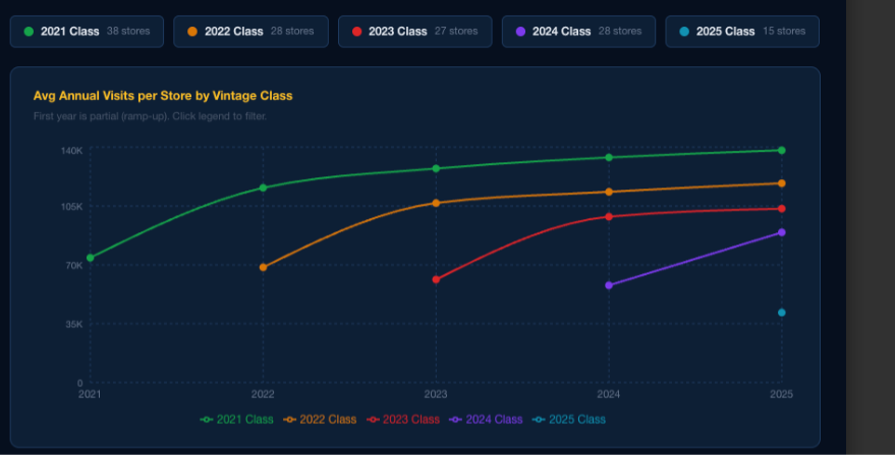 During this “epic period of value,” that Grocery Outlet (GO) has struggled to drive comp-sales and is now shuttering locations (-7%) is “provocative” to say the least. For context, Aldi grew comp-sales by around +4% in ’25 and Trader Joe’s by around +5%. By contrast, GO was only +0.5% for ’25 and -0.8% for Q4’25. That underperformance is also reflected in Outlet changing management during the year; new CEO Jason Potter was placed in February. Given that it’s been a year since the appointment, clearly, he gave the new classes of stores a year to shape up. Some didn’t and he’s focusing on those in the East. As a reminder, GO acquired Tennessee-based United Grocery Outlet (40 locations). It’s unclear if some of those are part of the planned closures (36). Since 2023, GO has added 12 new locations in Maryland and 11 in Pennsylvania. In 2025, the Maryland stores produced 70% of the nationwide traffic average, and Pennsylvania’s locations, only averaged 60%. The chart below shows new store productivity (in traffic) by class of opening. As shown, the new store productivity (NSP) trend has deteriorated each of the past four years.