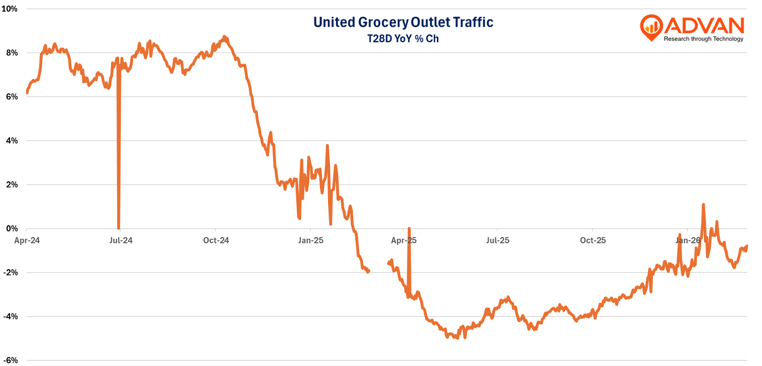 “On United Grocery Outlet, Potter said, “A strategic review of UGO. Finally, we’re scrutinizing every aspect of the business to remove distractions and improve shareholder value. To that end, we’ve made the decision to implement a strategic review of UGO. In an effort to focus on what’s important to returning this business to sustainable growth, we are reevaluating the organizational impact that would be required from a full integration of that business relative to the anticipated benefit.” – As shown in the chart below, traffic to the chain has been deeply negative during 2025.