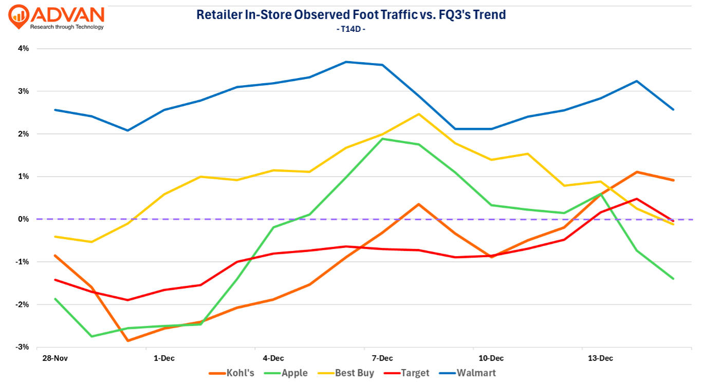 - The positive trend in foot traffic has held since Black Friday Weekend. Amazon, Walmart, Five Below, and Ross Stores have continued to outperform in traffic and spend. Best Buy, Target, and traditional department stores are trailing their FQ3 performance.