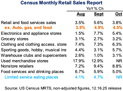 - The October monthly retail sales from Census report (today) reinforces that trends that have been underway all year continue, i.e. no new trends or inflections shown in the report.