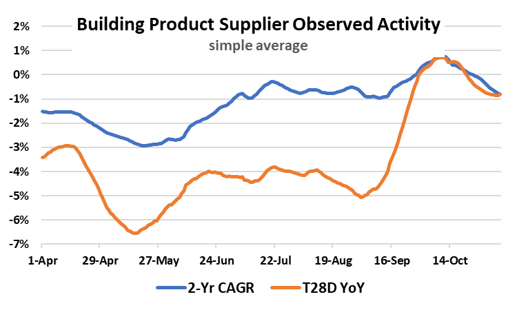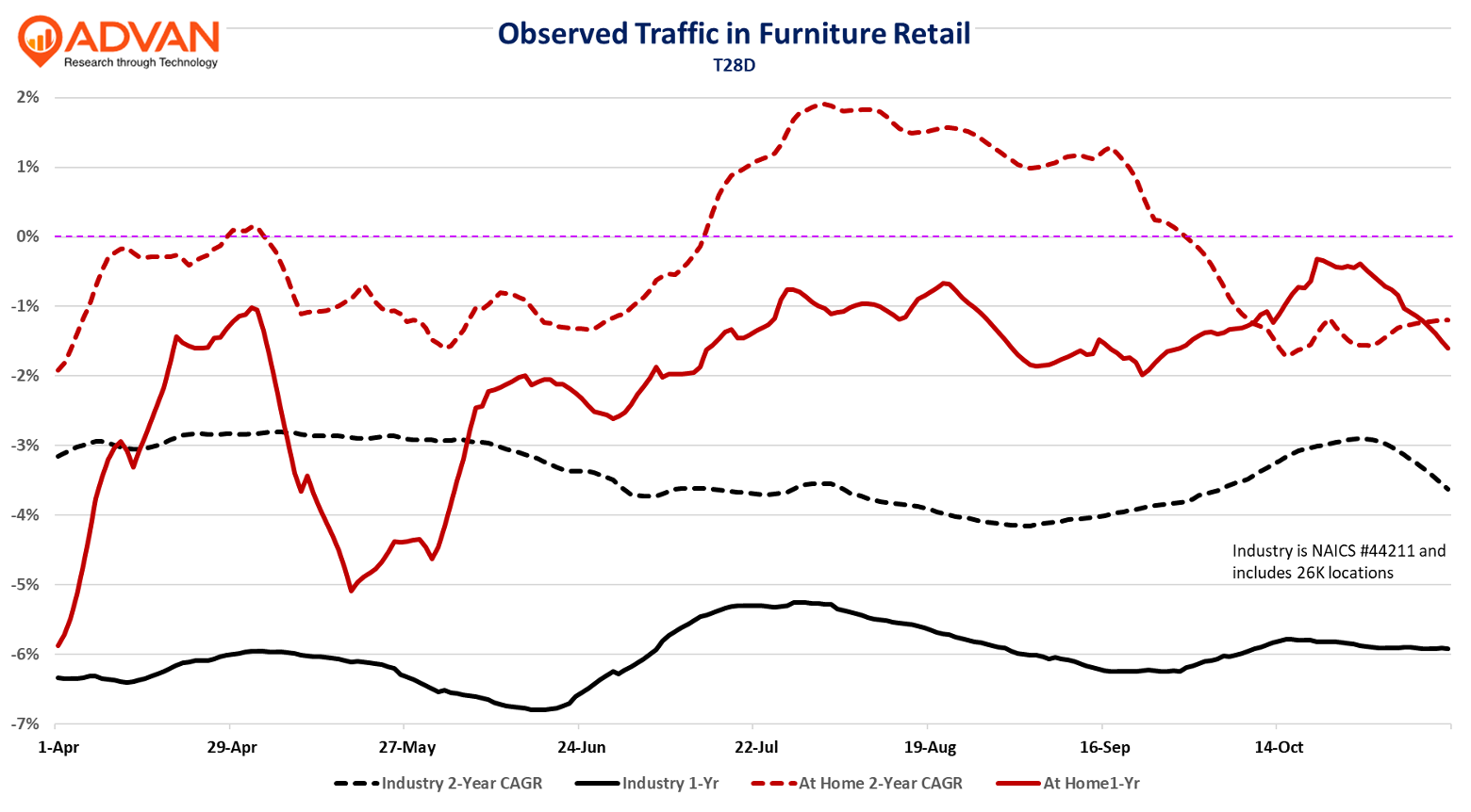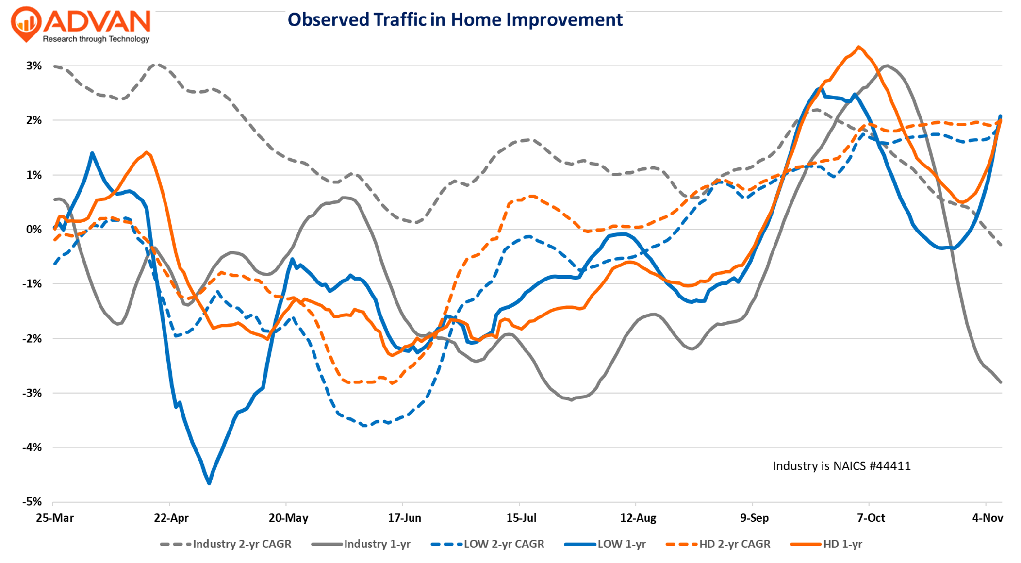 Observed traffic (per Advan) for the industry (NAICS # 44411, or home improvement centers) and HD/LOW has strengthened for the August – October period vs. the prior three months on a 1-year basis, but that’s the impact of Hurricane Helene. For HD / LOW, trends have strengthened on a 2-yr basis, but for the industry, it has softened modestly. Weather may have created a modest headwind to home improvement projects in the West. Home Depot is more exposed to the West.