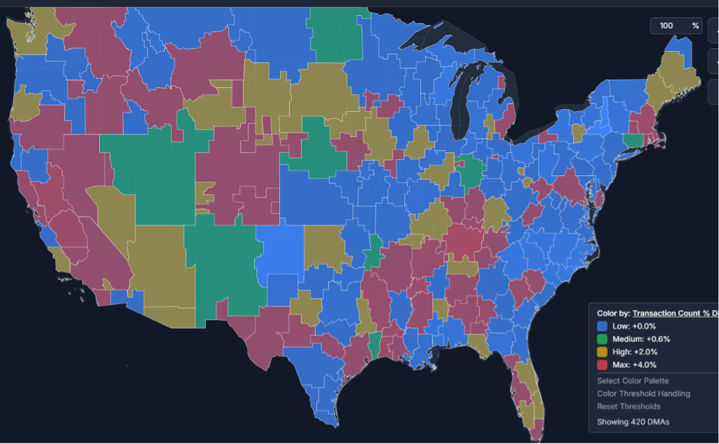 Performance’s CEO George Holm: But just to give you an idea where it’s slower and where it’s done better. the shutdown, of course, has affected our Virginia and Maryland company the most, and both of those were on extremely good growth rates going into that. Not much anywhere else. The international tourism, it’s been … the Upper New England area, where we’ve seen the total market slow. But actually, our companies there have been gaining significant share. So, it hasn’t had much of an impact on us. And of course, Florida and then Vegas has been affected quite a bit, and we do very little business in Vegas so that hasn’t had much impact. Where we’ve seen market slowness the most has been the Midwest, the upper Midwest. And we have markets there where we’re negative to last year and gaining share, which is a really unusual situation for us. So that’s how I would put it. But we don’t want to overdo this. I mean, we’re still running good independent growth. And if the – I think, if we didn’t have the shutdown and the slower business in a couple of markets, we would be just as we were in the first quarter. This characterization of regional trends is also clear in the graphic below. This is a heat map of where spending (transaction counts) is stronger (red) vs. weaker (blue), for our limited-service NAICS index for August. The northern border, the Midwest, and the Mid-Atlantic are generally all weaker. New York City, Connecticut, Florida, Colorado, Idaho, and the Sierra region are all doing better.