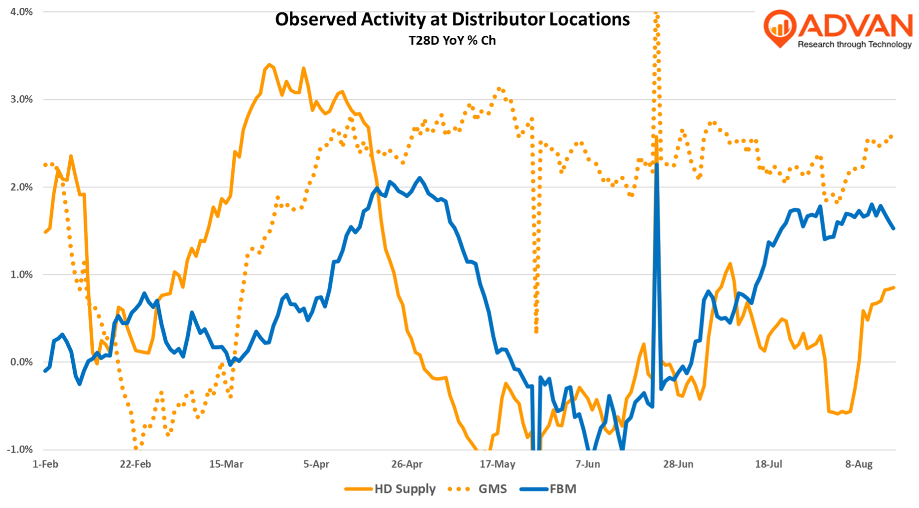 Overserved activity (Advan) at the distributor locations of the three, suggests that GMS has more business momentum this year and that HD Supply and FBM were more impacted by tariff inventory and order adjustments. That said GMS organic revenue was down -8.3% in CQ2 and so we know that revenue is more volatile than activity. In June, GMS’ CEO said, “We are cautiously optimistic that we are nearing the bottom of the cycle, although the intensity and duration of the downturn will vary by each market. [Q2] demand was down across both residential and commercial as economic uncertainty dominated the headlines.” However, as we demonstrated  earlier, wallboard activity picked up over the summer as shown by producer Eagle Materials. And so, there is a turn up happening somewhere out there – Home Depot and Lowe’s both see it coming.