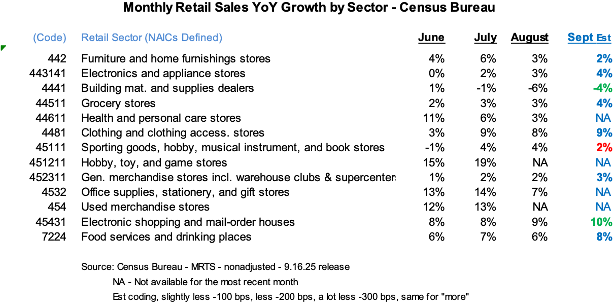 The Census Bureau was to release its report of September retail sales on October 16th. That is on pause now given the shutdown; as a result, folks will have to look at alternative data to understand how the US consumer is doing – a popular concern these days given the weakish new hiring and net job growth. With that, we are pleased to report that we believe retail spending (as defined by the Census’ report ) during September accelerated from August’s healthy pace, with the incremental driver being stronger spending by affluent households and continued improvement in housing-related demand.