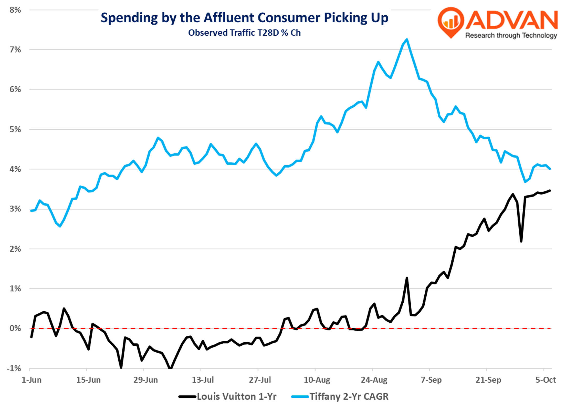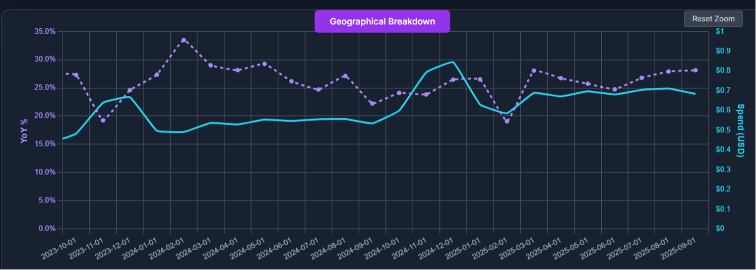 We’ve looked at a number of indicators of higher-end consumer expenditure, and they all show a similar pattern of acceleration. We’ve chosen to show traffic to Louis Vuitton locations as it’s a bellwether for luxury. Breathern Tiffany also shows a pick up until September, when it lapped a large campaign in 2023. Why the pick up? We believe it’s due to: (1) less policy volatility than in the 1H, and (2) the very strong equity markets – with the wealth effect charging up the upward right arm of our K-shapped economy.