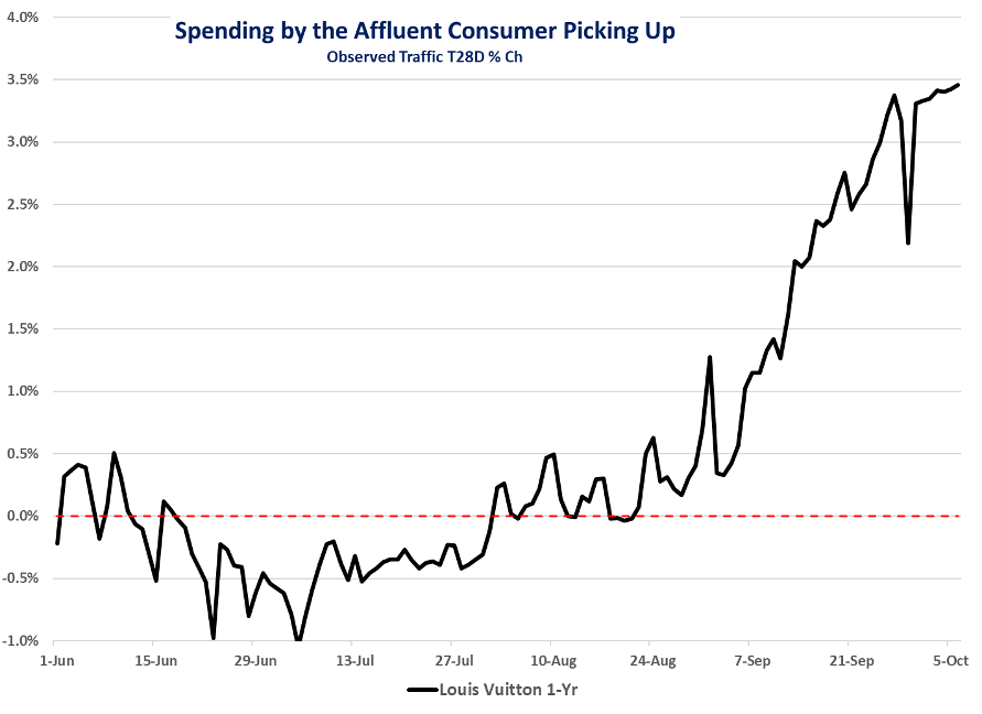As we previewed last week, high-end consumer spending in the US accelerated during Q3, which drove better retail sales for September and which we see in LVMH’s much better organic revenue growth for the quarter. Moreover, we also take Dollar Tree’s reiteration of its guidance and **Domino’**s very strong Q3 US Comps (+5.2%) as added evidence that there has not been a material degradation in spending by the less-affluent (despite market fears that there was and some data pointing to degradation). We also see support for our view of ongoing strength in the strong credit card business results from Citigroup, JPMorgan, Wells Fargo, and Bank of America. Lastly, we found additional support in today’s released Fed Beige Book, particularly on the strengthening high-end, but also an ongoing K-Shaped economy.