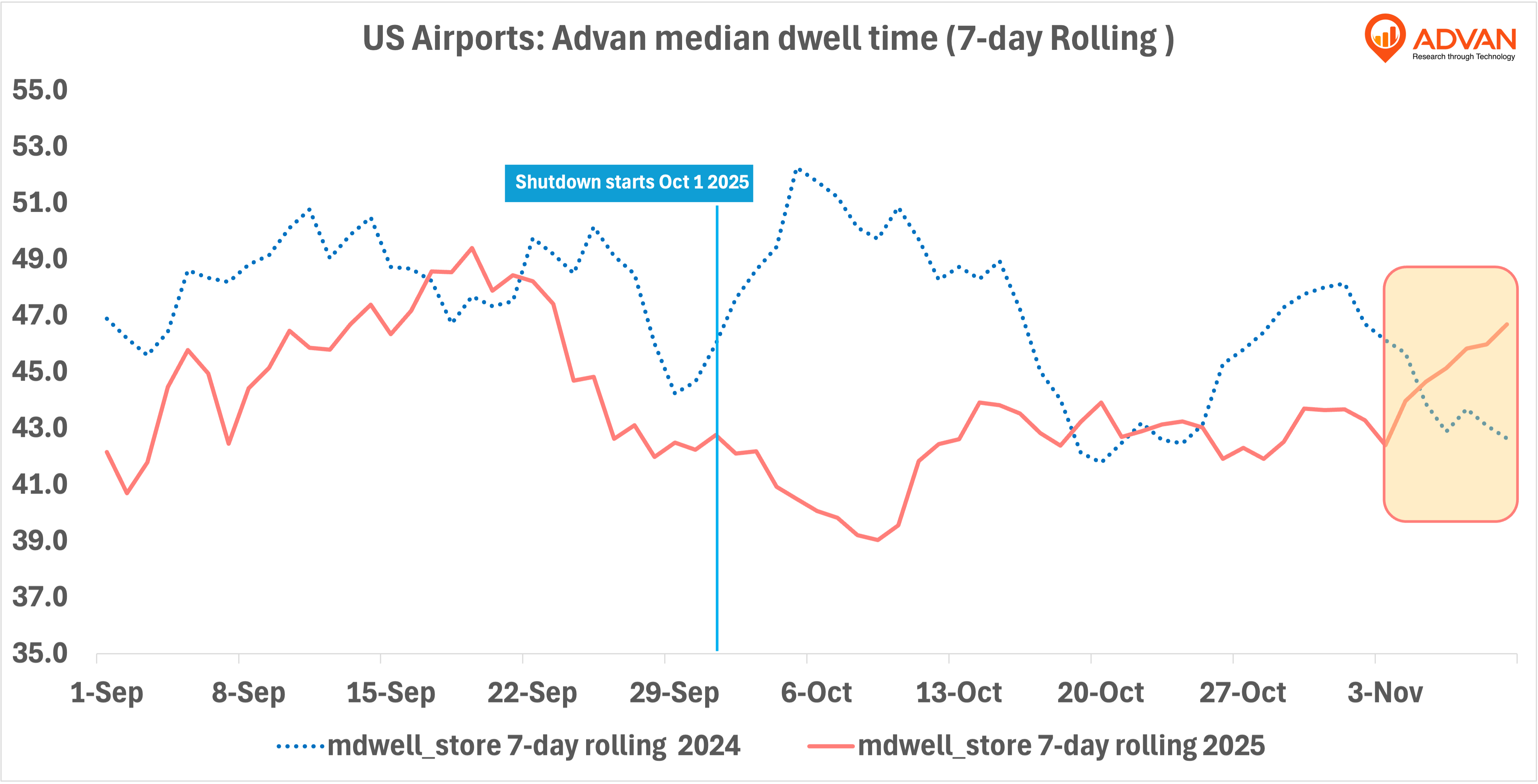 - Congestion showed up late in dwell time: Median dwell in 2025 started below 2024 levels but began to climb in late October and continued to rise into roughly November 9, suggesting that the system took time to fully “feel” the shutdown’s operational effects.
