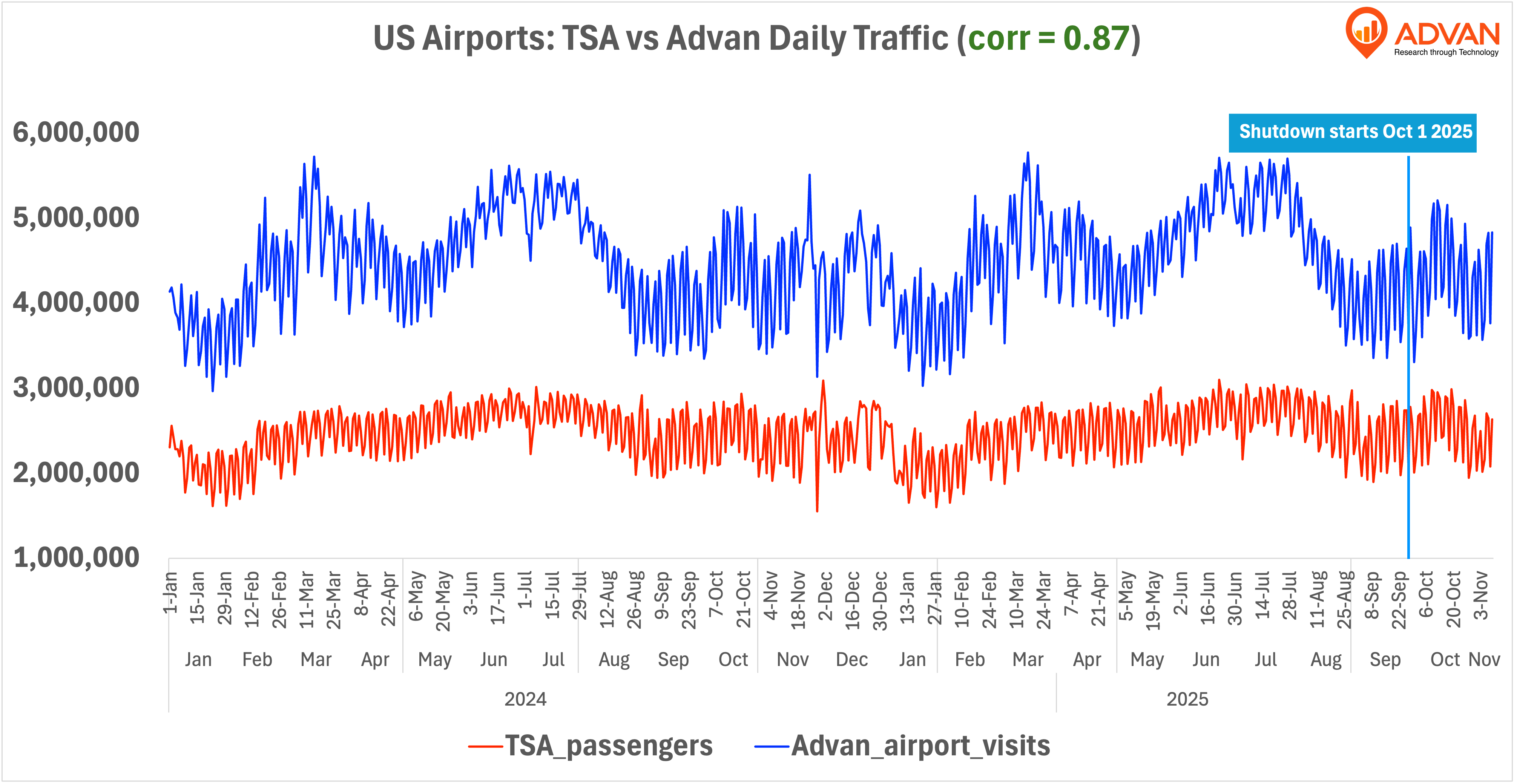 - Demand stayed strong: Both TSA and Advan show stable or increasing activity through the shutdown.
