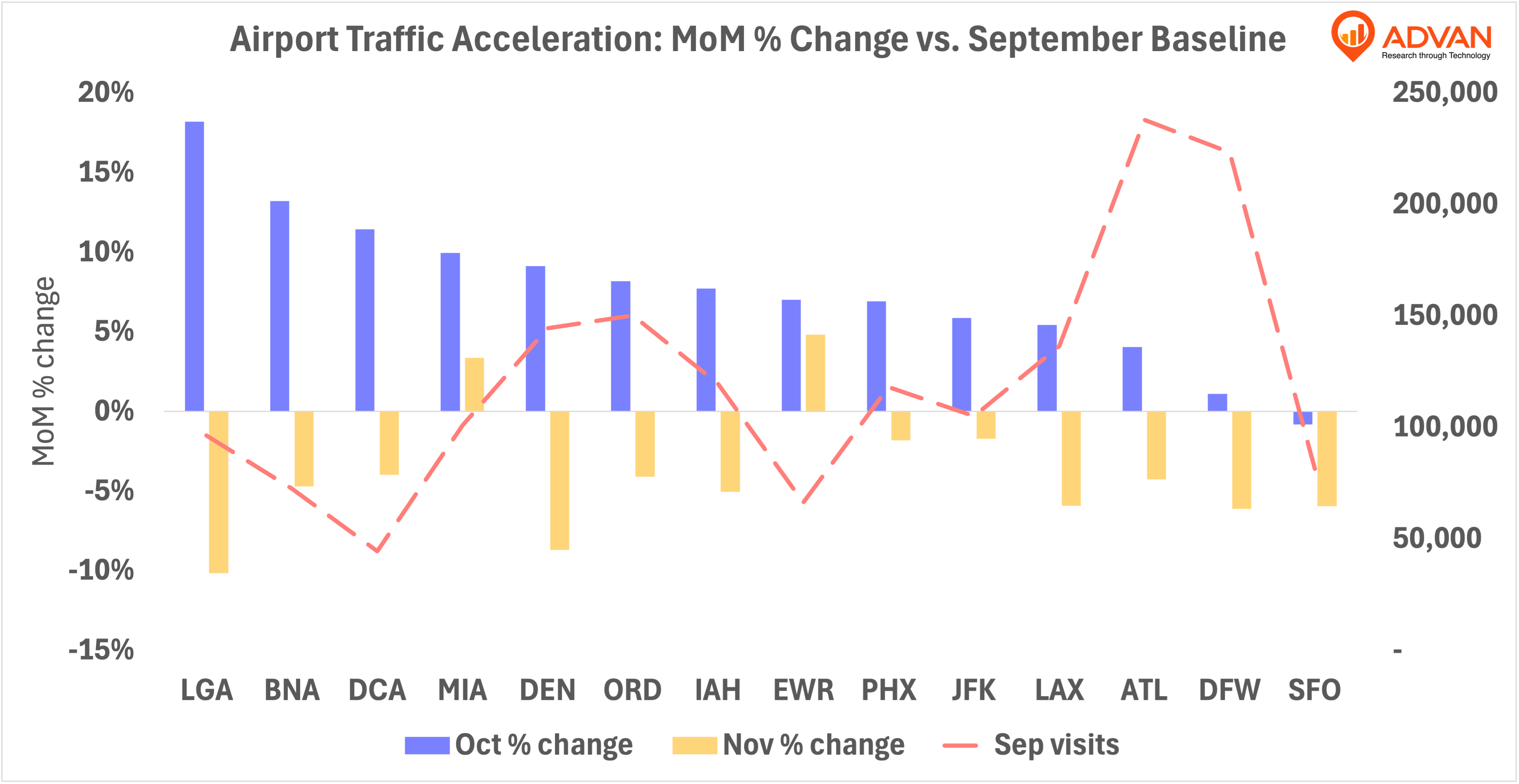 - SFO, JFK, ATL, DFW, and LAX saw more modest shifts, generally up to about +5% in October, followed by softer numbers in November, dipping roughly -1% to -5% relative to their September baseline.