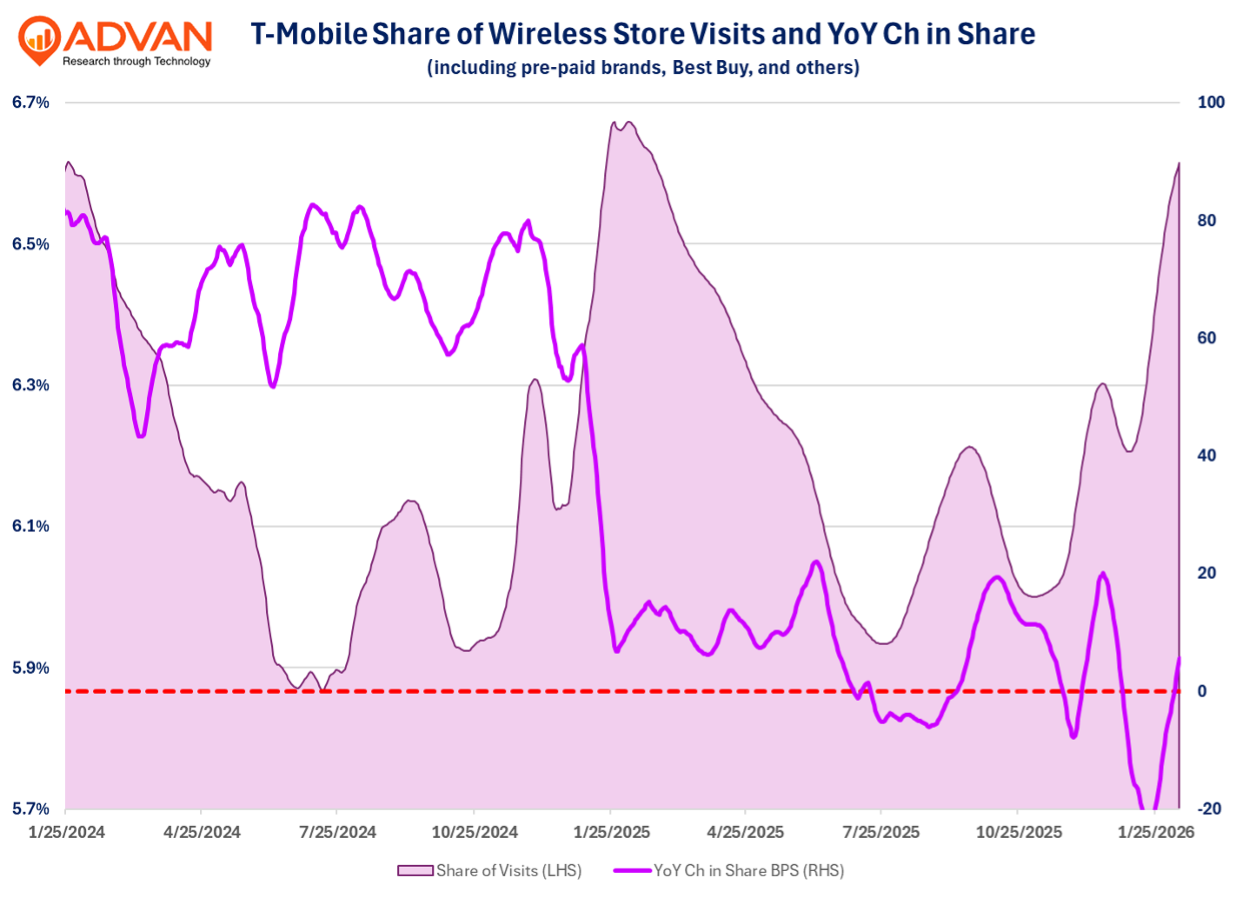 - Observed visitation (Advan) market share trends have aligned with T-Mobile’s trends in postpaid phone net adds.