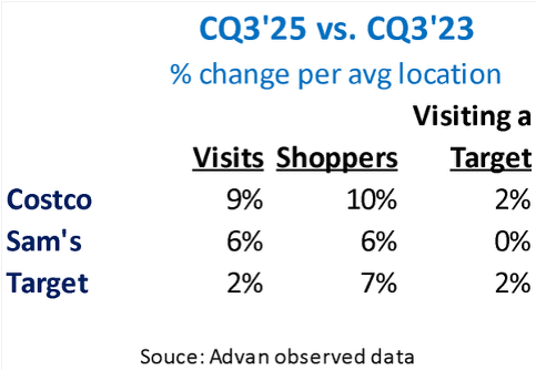 How this channel shifting looks in our data is shown in the table below. Over the past two years, the growth in visits and shoppers has been aligned for Costco and Sam’s ; by contrast, Target’s frequency-of-shop has declined. Over the period, while Costco and Sam’s have expanded their shopper base (membership), club members who also visited a Target is little changed, i.e. the incremental households, in aggregate, didn’t give Target consideration.