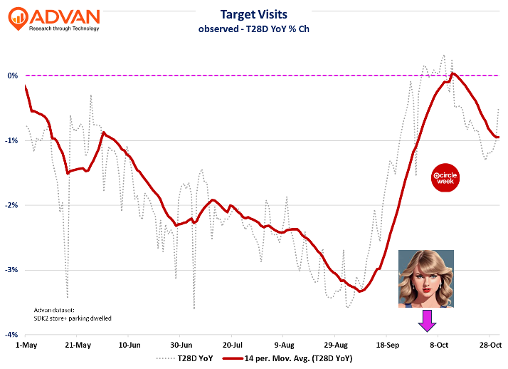 Since our last story on Target (FQ2 results), the company has had a successful Circle Week event, a Taylor Swift Exclusive, and a large layoff announcement. Given a new CEO, its weak financial performance this year, and the broadening trend of greater efficiency and “delayering” across corporate America, the layoff should have surprised no one. Also not unexpectedly, CEO Michael Fiddelke’s charge to spread the Tarjay across the store with greater urgency isn’t an overnight fix, and certainly not an easy fix. Finding authentic and inspired design and merchandise is an art, and art often takes time to imagine, design, and manufacture. In the meantime, Target is relying on coveted exclusives, such as Taylor Swift’s The Life of a Showgirl album release, and strong promotional events, like Circle Week. As shown below, these two took the observed traffic trend from down -2.5% up to around -0.5%. We’d also call out that the late September improvement is due to lapping Hurricane Helen’s large disruption last year. (Of note, others are suggesting significantly worse traffic for FQ3 than what our data indicates.)
