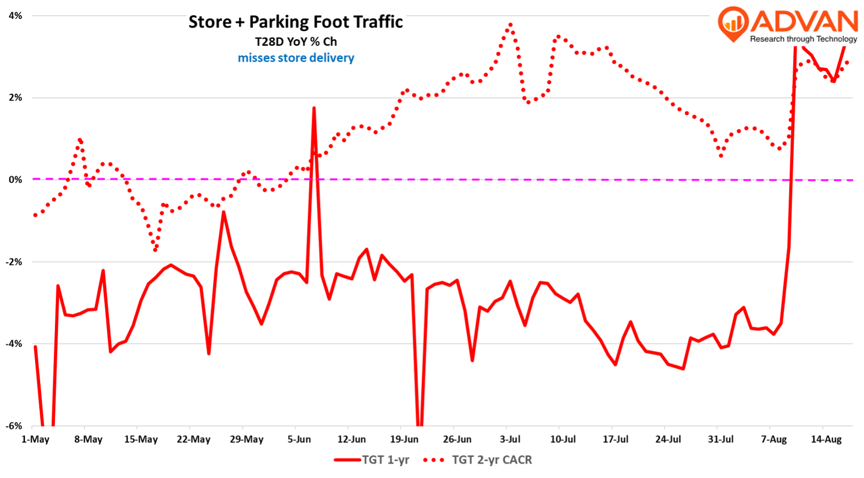 In terms of the quarter, total revenue declined -0.8% with advertising revenue up and merchandise sales down -1.2%. The -1.2% decline came from total comp-sales declining -1.9%, offset by strong new store performance and a 4.3% increase in curbside and store-delivery (+25%). The -1.9% decline came from a -3.2% decline in “inside the store” comp-sales. Less the decline in average transaction amount (-0.6%), store comp-transactions declined -2.6%. Observed store traffic (by Advan) was down -3.1%, implying some improvement in the conversion rate. As shown in the chart below, observed traffic improved throughout the quarter, especially the 2-year trend. Management shared that June+July were stronger than May, which suggests that’s where the conversion rate stepped up. If true, that is the most important green shoot in the results, as an improvement here typically precedes an improvement in traffic. Observed traffic in August is up +2.8%, i.e. much improved – management also said that back-to-school and -college were going well. Cornell also said, “We’re continuing to see improvements in quality measures surrounding the store experience, including on-shelf availability. And we continue to see particular strength in our business with guests on newness and innovation in our assortment…” However, as management didn’t increase guidance for the 2H, that implies “caution” and uncertainty as to how much of the improvement is back-to-school season and more amenable weather vs. an underlying upturn in the business to sustained transaction and sales growth. (Find our Q1 analysis here .)