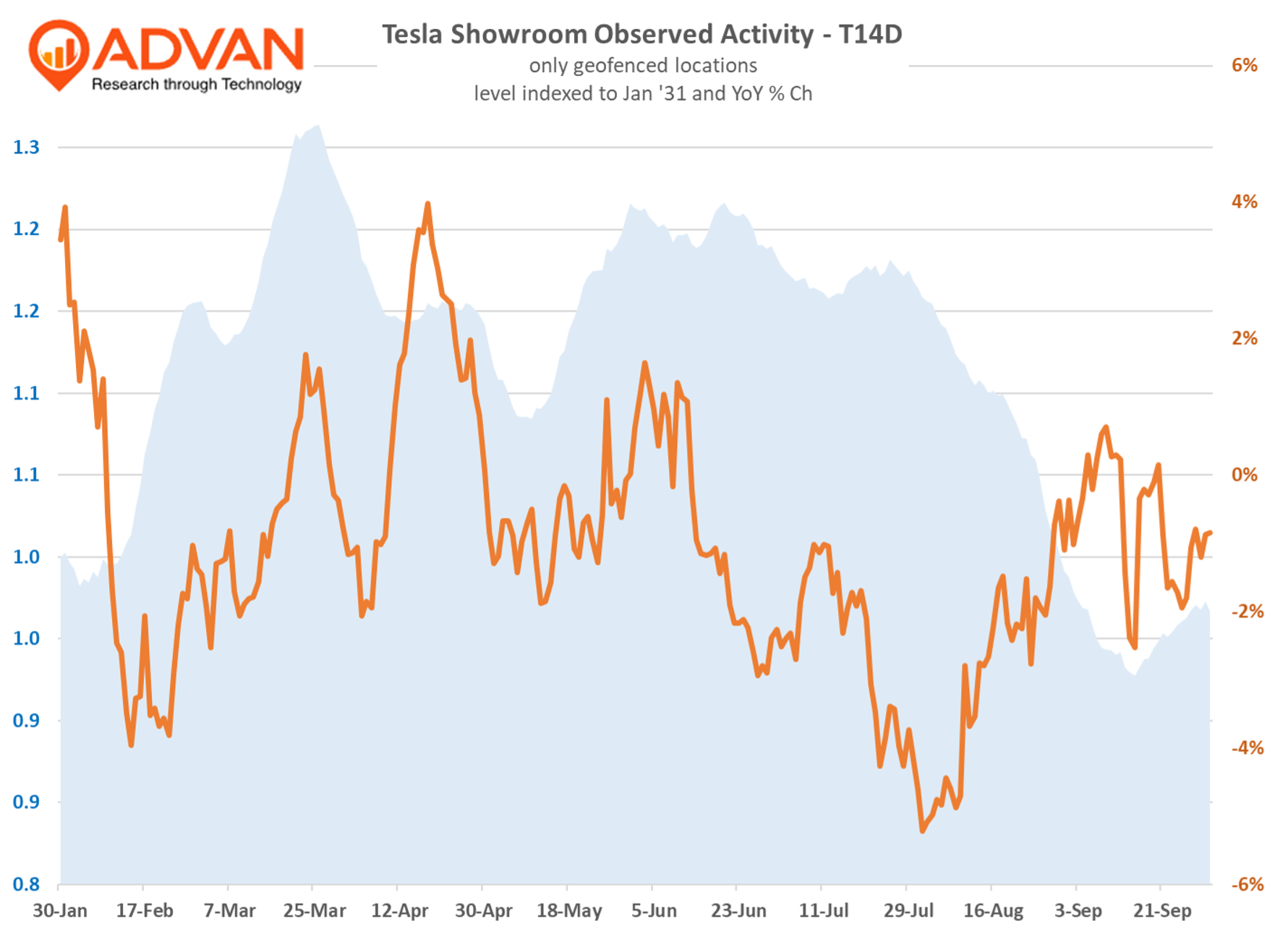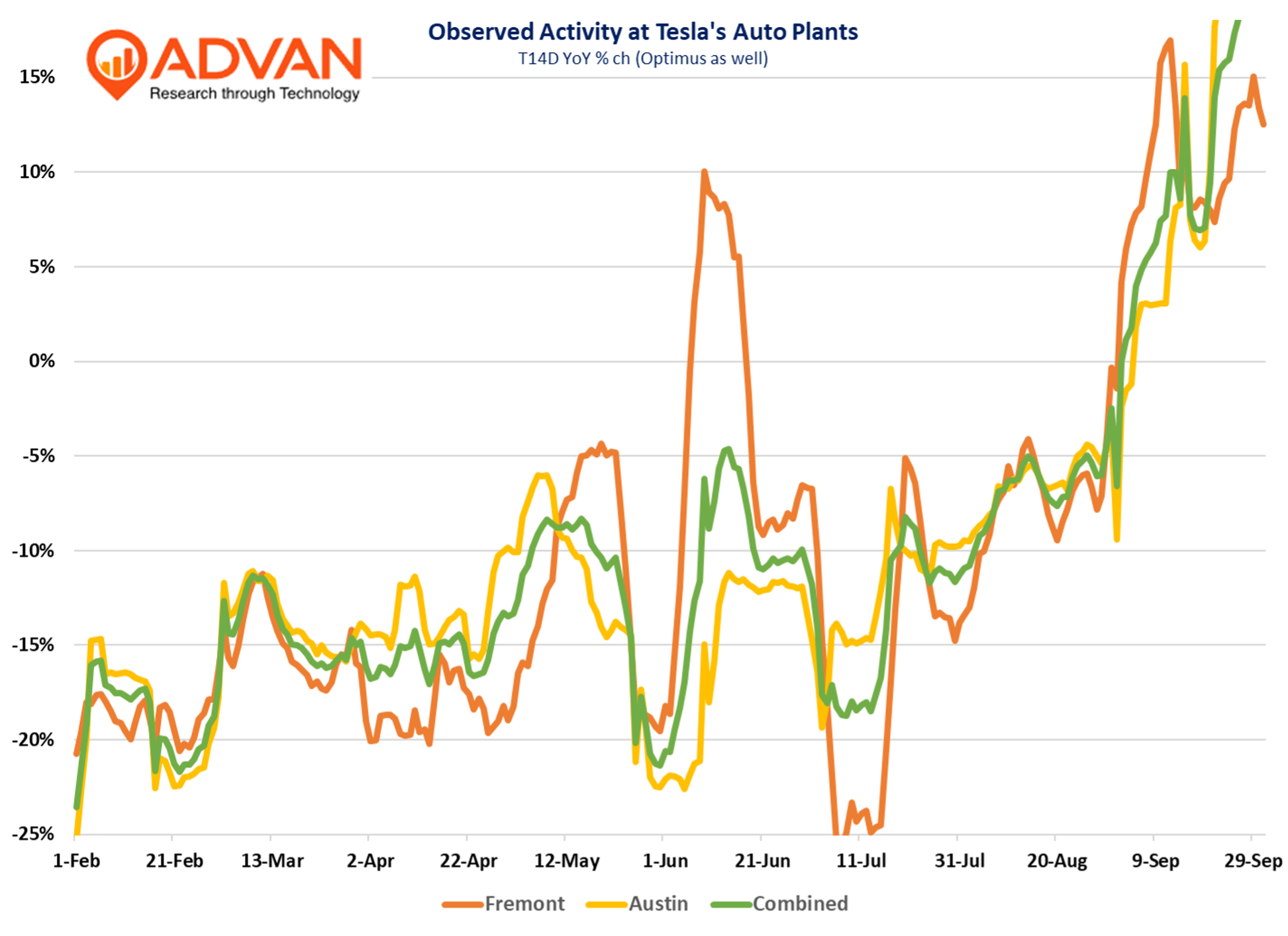 As previewed , Tesla’s Q3 global deliveries (+2%) were far ahead of expectations and Q2’s rate (-13%). Reported deliveries of 497K where 12% above the sell-side consensus of 443K. Given 3rd party reports of sales being down in Europe (-20% ish) and China (-HSD ish), the US was up strongly as Advan’s manufacturing and showroom data suggested. September domestic sales are estimated to be +6% per Morgan Stanley’s analyst. As shown, visits remained robust into the end of the month and the expiration of the $7500 tax credit. That suggests that that Tesla found a way to make “deliveries” quickly. We’ll come back to the story at the end of October to see show what the air-pocket looks like; however, given that the plants are still running hard, there may not be much of an air-pocket. That’s curious and unexpected!