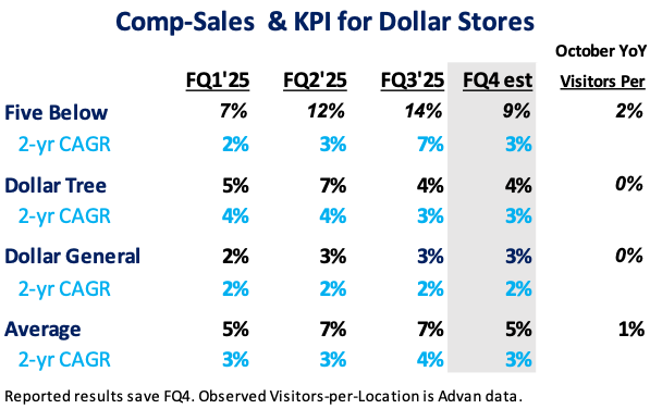 Despite the widely reported pull-back in spending by the less-affluent during the September – November period, for FQ3, the dollar stores reported comps in line with expectations, resulting in consistent 2-year trends, save Five Below, which again, reported blow out results; that stems from selling purely discretionary merchandise driven by a rocket-fueled toy / merchandise trend of Lilo & Stitch, K-Pop Demons, and SpongeBob. (This has happened several times in the past – Fidget Spinners, Squishmallows, etc.) No competition from Temu also helped (as they would have been very involved in the collectables / toy category). Additionally, all three retailers have new management and “back-to-basics” / Retail 101 initiatives. Back-in-the-office has also improved execution and coordination on delivering exciting merchandise. The better top- and bottom-line financial results demonstrate that all three are connecting on the 101 initiatives. Five Below’s growth in visitors-per-location is also very impressive, especially as the increase would be higher on a comp-basis. The same applies to Dollar Tree and Dollar General; but the gains that they are making in higher-income households are masked by softness in lower-income households.