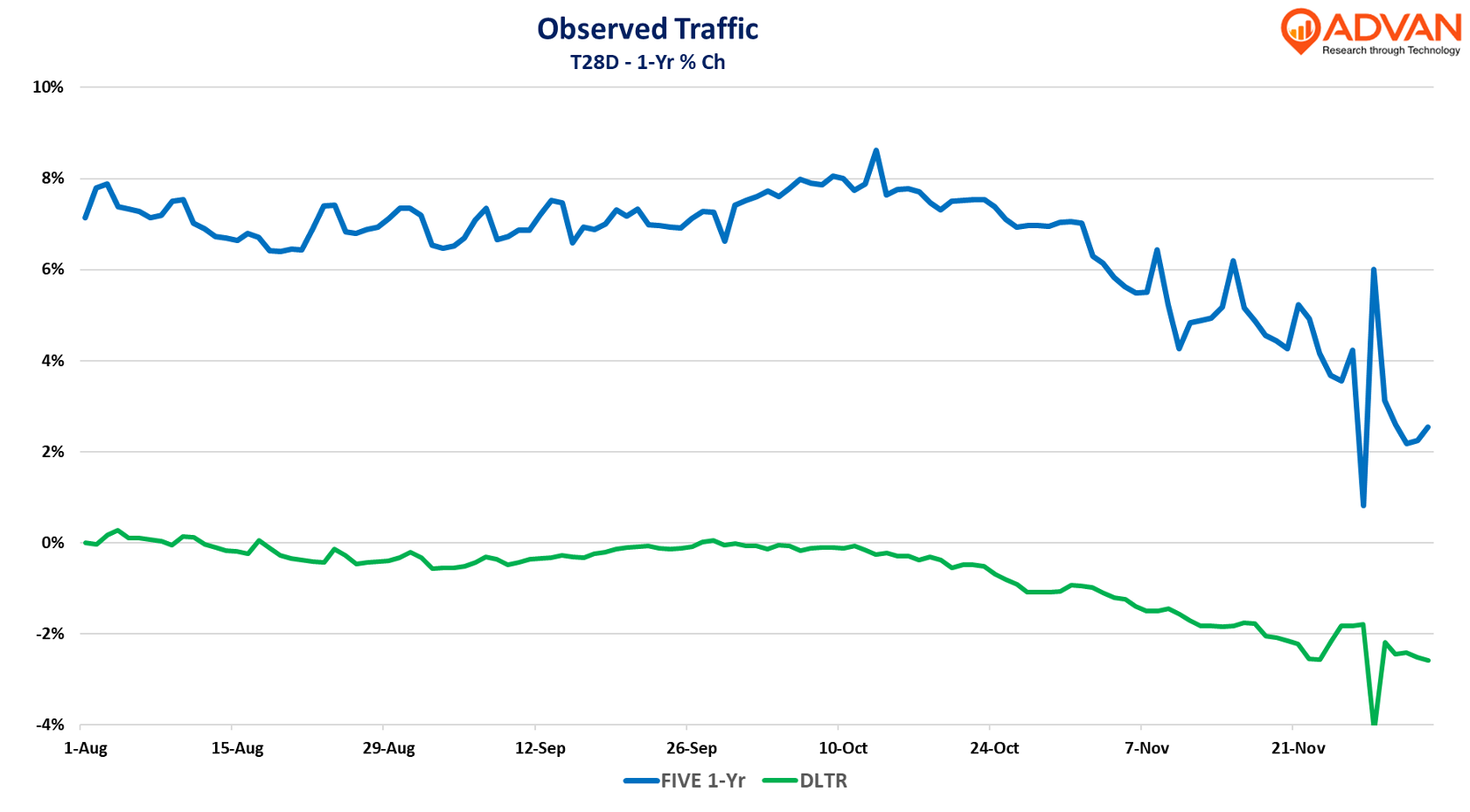 In terms of the quarterly cadence, Creeden said, “Comparable sales increased 4.2%, a nice acceleration from the quarter-to-date trend of 3.8% we shared in mid-October. As the results suggest, October finished strong, driven by momentum in our multi-price assortment and a great Halloween. Our Q3 comp was all ticket-driven as traffic was slightly negative.“ Advan’s observed visits for Dollar Tree match this pattern. We suspect that the lull following Halloween is just the normal seasonal lull before the Christmas Holidays get moving. Moreover, we are not concerned about the Dollar Tree’s softer Black Friday Weekend. That weekend is less of a thing for dollar stores than other retail brands / categories. For Dollar Tree, daily traffic for Friday – Monday averages only 7% more than earlier in the month; by contrast, Best Buy’s Weekend average is 72% higher and Dick’s Sporting Goods is 60% higher. Five Below is in the middle at 30%.
