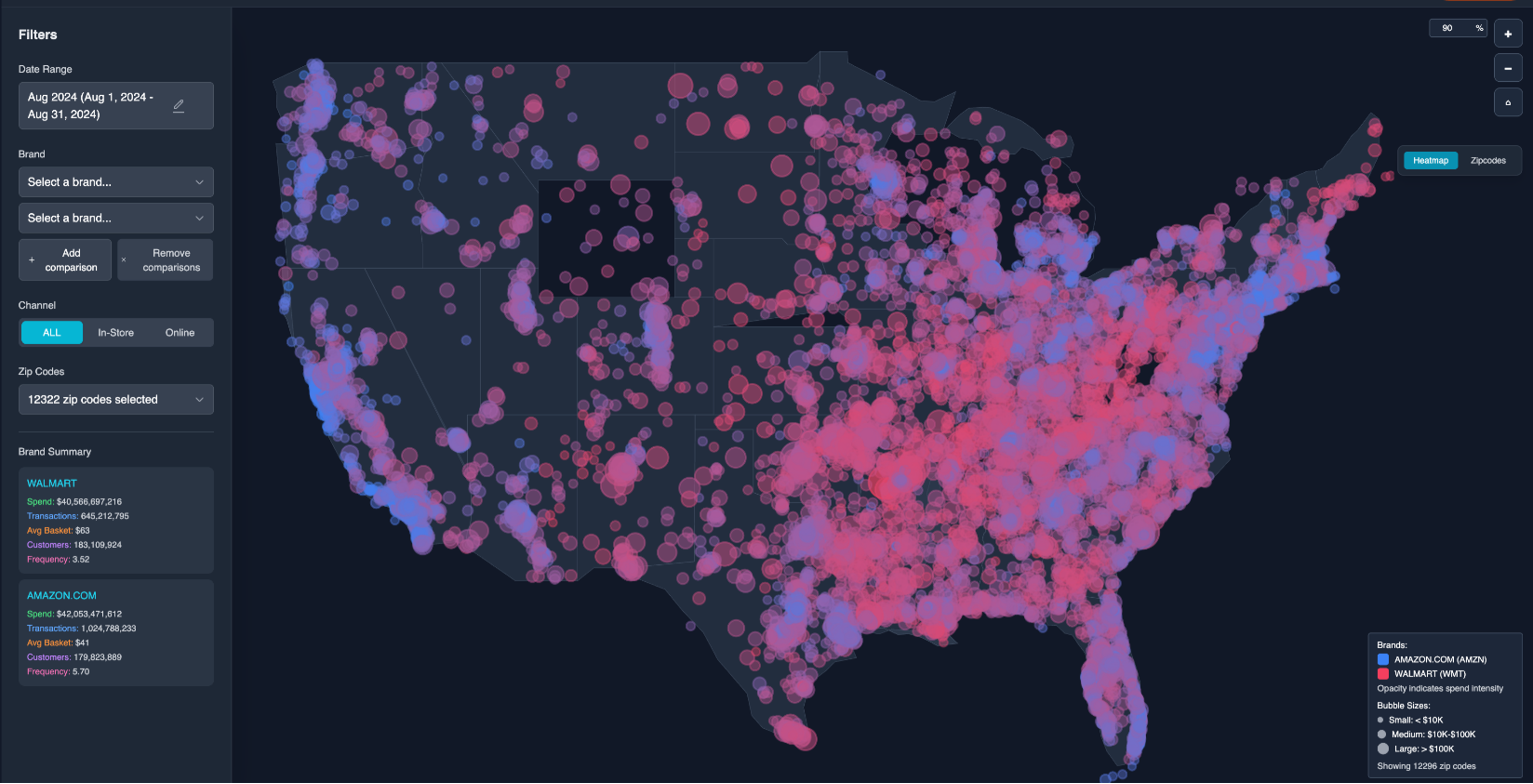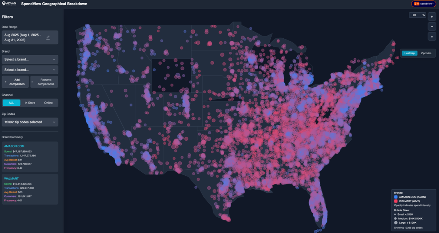 Advan has launched its SpendView™ geographic visualization product. This shows historical brand and location level, as well as consumer spending from a zip code / DMA / regional level (within where the spender lives). This is based on our panel of over 120M debit and credit cards. We then aggregate that spending by retailer brand and on- vs. off-line in terms of the utilized channel of a given brand. The charts below contrast Walmart and Amazon, August 2025 vs. August 2024, nationwide. The red dots are spend at / on Walmart and the blue dots are spend on Amazon. For Walmart’s fiscal Q2’25 we estimate gross spending at Walmart stores as $106B; it reported net $100B (also an estimate). The gross figure doesn’t include returns, which the net does; as such, the figures are aligned with one another. For the same period, SpendView™ shows Walmart stores + ecommerce spending increasing +6.3% and reported revenue increased +5.0%; the slight delta is likely due to the strong growth of third-party sellers. For Amazon’s Q2’25 the SpendView™ estimate is that consumer spending was around $138B; its financial results suggest around $140B in gross merchandise value and aligned with the SpendView™ figure. For the same period, SpendView™ shows spending increasing 10.2% and reported results suggested units sold growing +10%; again, the SpendView™ figures align well with reported results. For fiscal Q3’25 QTD, SpendView™ shows spending up about 7% YoY at Walmart and +12% at Amazon. Last week, we wrote that we estimate that Walmart was up +6% in August based on foot traffic. The Amazon figure is slightly higher than our going-in expectation, but aligned with Census’ monthly retail sales .