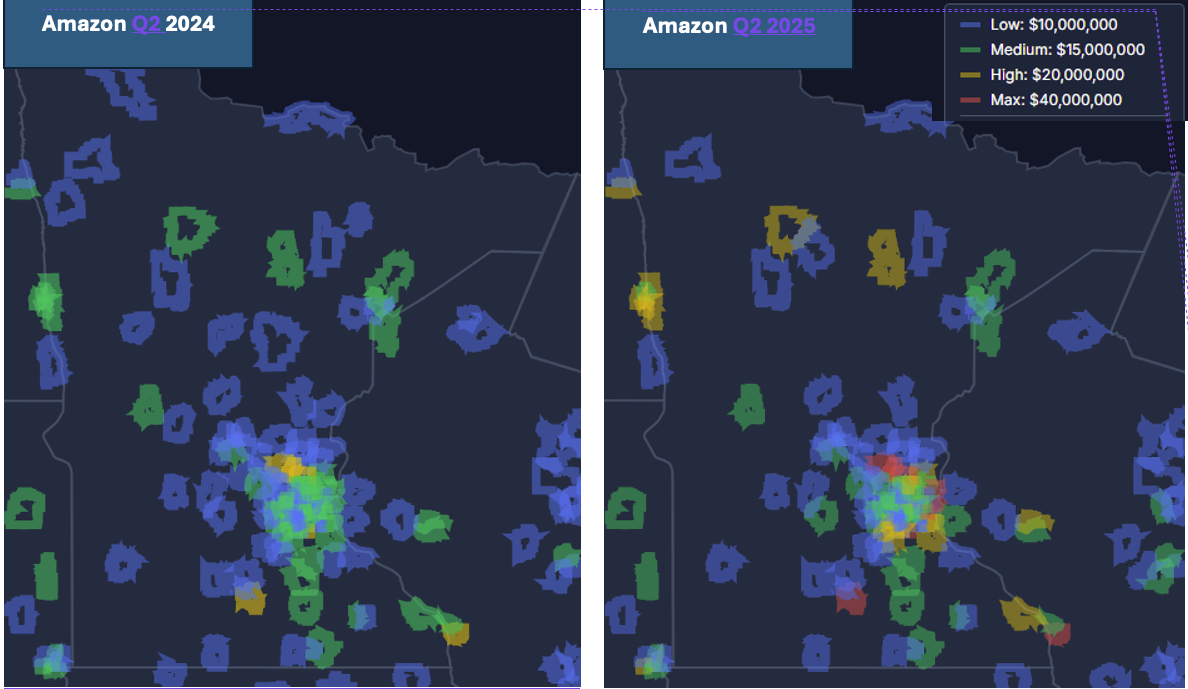 Amazon is driving double-digit $-volume growth in the US by making inroads into suburban and smaller market with same-day and next-day. SpendView™ allows us to see that dynamic for Minnesota. Shown below are the zip codes in Minnesota that rank in the top 10K for spend on Amazon. Many of the regions that were coded green in Q2’24 have moved in 2025 to the higher band (over $20M in quarterly spend). Many of 2024’s gold, have moved to red / max ($40M threshold).