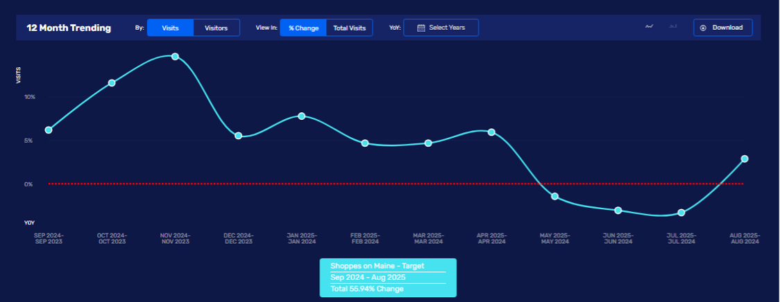For Rochester, Minnesota – home of the Mayo Clinic (and lots of high doctor incomes), the spend on Amazon in Rochester’s zip codes 55901-06 increased to $48.6M in Q2’25 from $47.8M in Q2’24 (per SpendView™). While that’s an increase, it’s a small one. Impressively, incumbent Target saw spending increasing to $21.0M from $19.5M, or twice the $-volume as Amazon’s. Target’s largest increase was in zip code 55904, a +$450K increase (+8%). Advan’s observed visitation for the store in that zip code (Maine Ave), shows only a +2% increase in foot traffic for CQ2. This year’s weather in May and June in Rochester was abysmally cold and wet. That seems to have led Target shoppers to choose Target.com vs. traveling to the store, and showing off good performance again vs. Amazon. In fact, SpendView™ shows spending on Target.com in 55904 increased +17% for the quarter.