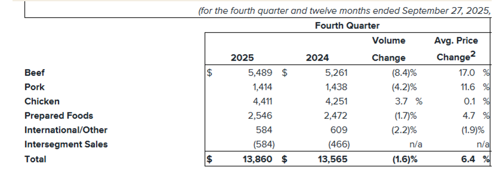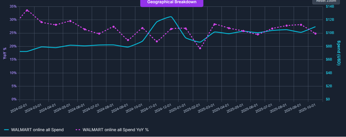 For FQ3, several significant trends have amplified/emerged that will impact Walmart’s results. First, Walmart enjoyed a very strong back-to-school season (here ). Second, as we’ve been writing frequently , since B2S, the less-affluent consumer has become more price-sensitive and volume has softened for fast food (limited service), consumables (private label taking more share + cutting consumption), and in leisure & entertainment . This has also led to a more pronounced paycheck cycle in Q3. Consumers are also making trade-offs to get the calories and proteins they need, more chicken, less beef – see the table below of Tyson’s Q3 results. Third, there’s all of the associated impacts of the Federal Government shutdown during October. Fourth, the more-affluent have been on a spending spree since August. Fifth, the impacts from increased GLP-1 usage have become more pronounced on food and alcohol consumption. And sixth, Amazon’s launch of same-day perishables in 1000 cities was significant (see our take here ). Further muddying the picture is Hurricane Helene, which drove a lot of stock up purchasing in September of 2024, and which temporarily dislocated 375K families. And lastly, gross margin in the 1H expanded by 25bps, FQ3 will be the first quarter that is fully loaded with tariffed goods, as such it will reveal how much it passed through to the consumer, i.e. what’s Walmart intent on demonstrating great value.