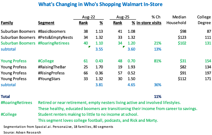Next week kicks off retail earnings, including home improvement (our preview here ), Target (here ), off-price, and the behemoth – Walmart. Prior to the pandemic, generalists used to view Walmart as an important read on the consumer; however, Walmart generally was a misread, as it skewed rural and to the less-affluent. As followers and readers know , Walmart’s “contemporization” won them significant market share in the suburbs and near-burbs, and with the more-affluent. The table below shows that between 2022 and 2025, Walmart gained 11% more in-store shoppers; outperforming that growth were Suburban Boomers: Roaring Retirees (21% growth) and **Young Professionals: College (**81% growth). In August of 2022, Young Professionals: College ranked #61 out of #80 cohorts shopping inside a Walmart, by August 2025, it climbed to #48. This broadening of Walmart’s shopper base now makes the brand a closer read on our consumer economy, and as such, something to watch more closely (as we argued in our presentation at the National Association for Business Economics Annual Meeting). For analysts and economists, the need is more pressing these days due to the absence of national economic statistics.