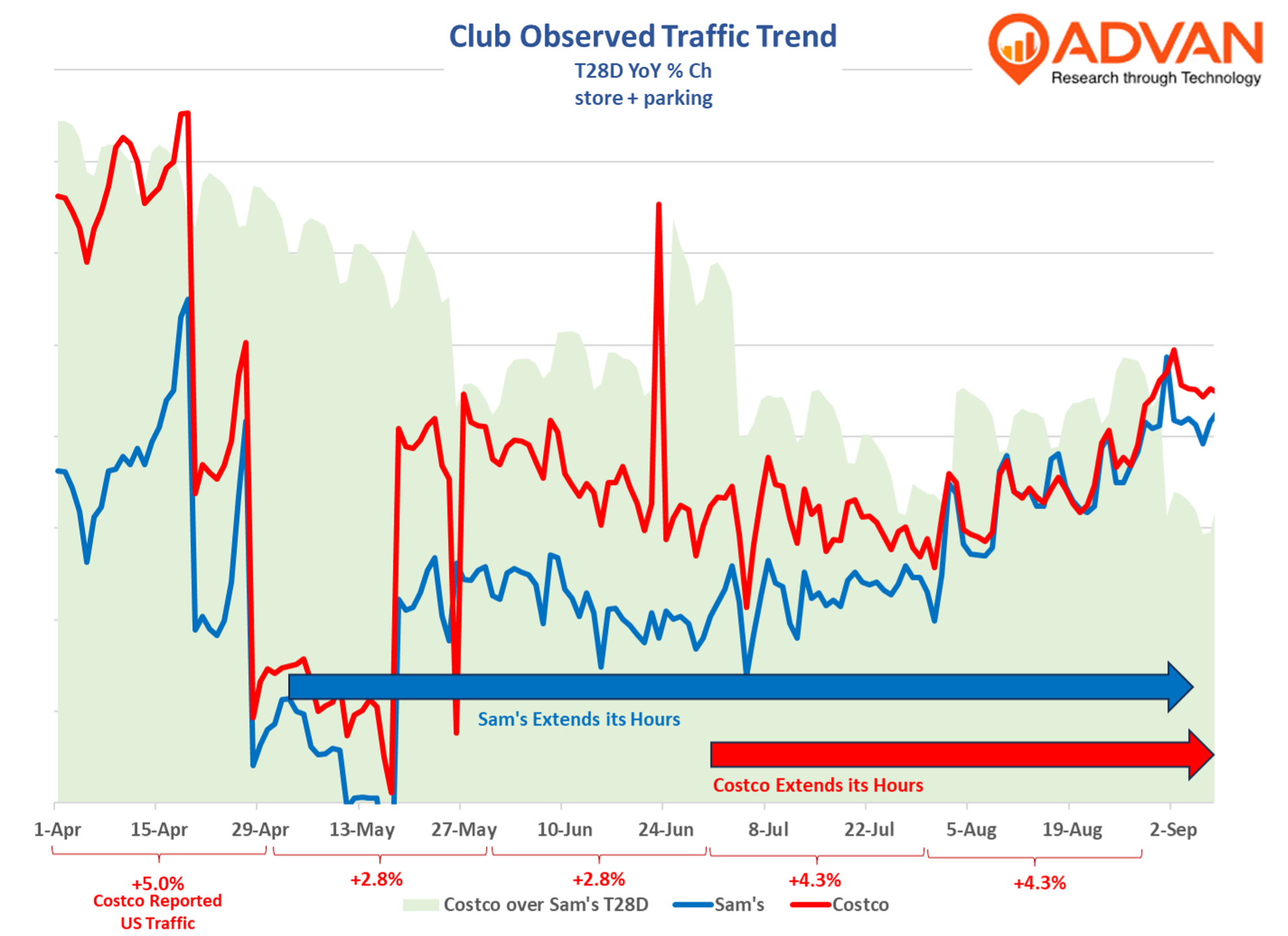 Since the change, the trends for Costco’s traffic and customer spending have improved, as shown. The lift to spend is slightly less than the lift to traffic. However, Sam’s has also shown a firmer trend; as such, it’s hard to know how much of the improvement is coming from the expanded hours vs. just more share capture with consumers fearing higher prices from tariffs and other matters, especially in consumables. August CPI has especially hot in the fresh category (and coffee). The all-items index rose +2.9% YoY, but beef & veal rose +14%, other fresh vegetables, +4%, apples +10%, bananas +7%, and coffee +21%. Fresh is where club wins in value, and historically high inflation in fresh has moved market share to the clubs. Conventional grocers know that and so we were not surprised to hear Kroger’s interim CEO Ron Sargent say this week on its earnings call, “ We know that fresh products are important to our customers, specifically in meat and produce. These categories continue to outpace center store sales and reflect the growing demand for healthier options. Our sales growth in fresh category shows that we’re making strong progress in the categories our customers care most about… Improving grocery volume is also important to us. We’re making strategic price investments, which led to another quarter of sequential improvement.” And CFO David Kennerly, “We are encouraged by the continued improvement in grocery volumes, particularly in the perimeter of the store.” (The perimeter of the store is dominated by fresh.)