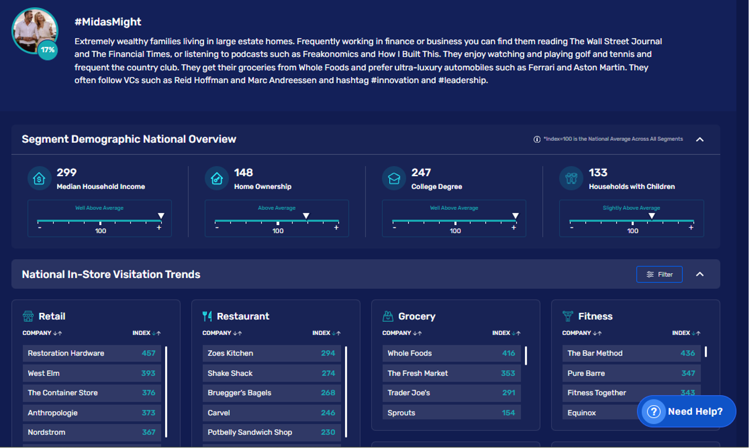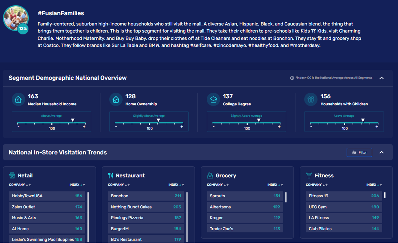 What type of consumer / household is visiting Wilmette? Looking at psychographic cohorts as segmented by Spacial.ai, Wilmette’s number one cohort was the MidasMight high-income household, which made up 17% of visitors. (There are 80 segments; thus, an average cohort size is 1.25%.) By contrast, MidasMight was only 1% of the visitation to IKEA’s stores. Wilmette’s #2 was SatelliteScions at 10% of visitors, far above Schaumburg’s 5% and Wilmette’s 4%. FusianFamilies (1.56X likely to have children) was #1 for Bolingbrook (12%) vs. Schaumburg’s #4 / 6% and Wayfair’s 4%. Our conclusion from this analysis is that the Wayfair store brings in a large number of visitors with outsized spending ability, and they are quite distinct from IKEA’s visitors. It will be interesting to see if Atlanta and Denver match that distinction.