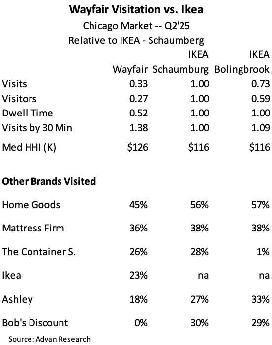The following table benchmarks Wilmette, which opened in May ’24, against the two IKEAs in the Chicago market. Observed foot traffic to Wilmette is less than a third, but IKEA does monster traffic; the Schaumburg location was the 6th in the nation for traffic. As such, the “third” is a large amount on an absolute basis, bringing in over half the visitors that the closest Target store (Glenview) delivers. Wilmette also draws from a larger trade area than IKEA with visitors driving more than 30 minutes being 1.38X more prevalent, on a relative basis, than Schaumburg. Its shoppers’ median income was 10% higher than IKEA, which was our expectation. The cross shopping to other furniture / furnishings brands is interesting and suggests that Wayfair is attracting quite a different household.